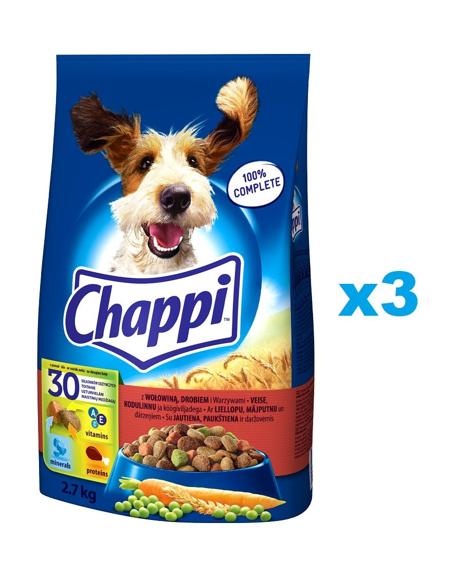 CHAPPI Suché krmivo pre psov s hovädzím mäsom, hydinou a zeleninou je kompletné a vyvážené krmivo, ktoré vášho psa dobre zasýti, urobí ho šťastným a plným života. Receptúra CHAPPI poskytuje vášmu domácemu miláčikovi viac ako 30 živín vrátane: mastných kyselín, vitamínov: A, E, D3, minerály a bielkoviny. CHAPPI s hovädzím mäsom, hydinou a zeleninou je šťavnaté krmivo pre psov vo forme chrumkavých granúl, ktoré určite potešia chuťové bunky vášho domáceho maznáčika. Toto suché krmivo pre psov vyvinuli odborníci na výživu a veterinári z WALTHAM Institute of Animal Science.