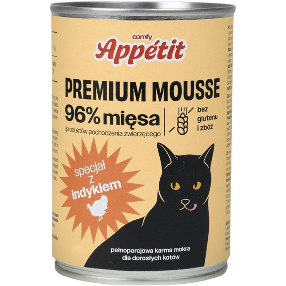 Comfy Appetit Premium Mousse je kompletná konzerva pre dospelé mačky. Krmivo obsahuje 96 % mäsa a živočíšnych produktov.
