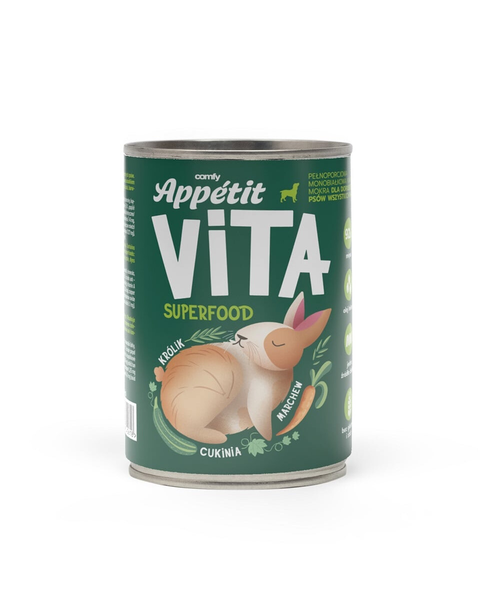 Comfy Appetit Vita Superfood je starostlivo zostavené mokré krmivo pre psov s ľanovým olejom, ktorý má protizápalový účinok, zlepšuje stav kože a srsti vášho psa a podporuje imunitný systém. Vita Superfood obsahuje len to najkvalitnejšie mäso a neobsahuje kuracie mäso, obilniny a lepok. Obsahuje až 92 % mäsa v jednej porcii, takže váš pes mu neodolá!