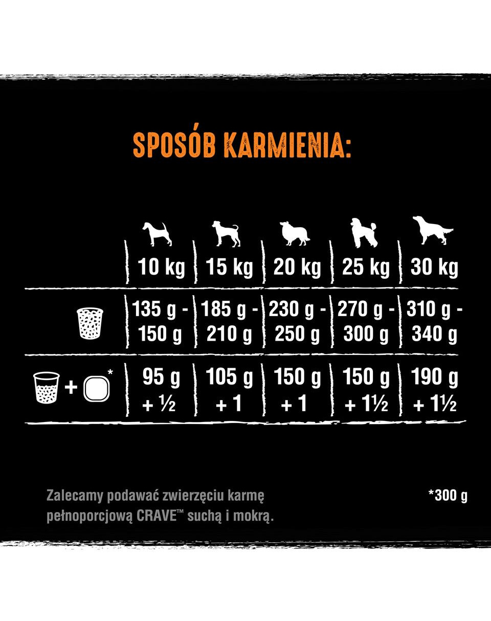 CRAVE ™ s morčacím a kuracím mäsom je kompletné a vyvážené krmivo pre dospelého psa. Vyznačujú sa vysokým obsahom mäsa a živočíšnych produktov (najmenej 60%) a bielkovín (až 37%). Psy plné energie nájdu toto jedlo, ktoré spĺňa ich výživové potreby. Strava akéhokoľvek moderného štvornožca má veľa spoločného s prvotnými potrebami jeho divokých predkov. V jednoduchom zložení CRAVE ™ nenájdete arómy, konzervanty a farbivá. Uspokojovaním prirodzených potrieb vášho psa sa staráte aj o jeho najlepšiu kondíciu a staráte sa o to najlepšie v ňom.