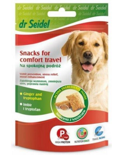 Pełnowartościowy przysmak dla psów wzbogacony o imbir i tryptofan, które zwiększają komfort podróżowania psa i jego właściciela. Imbir łagodzi mdłości i zapobiega wymiotom. Tryptofan - prekursor serotoniny ("hormon szczęścia") zmniejsza napięcie mięśniowe i podatność na stres. zalecenia: Smakołyki polecane przed i w czasie podróży, aby zmniejszyć ryzyko złego samopoczucia i uspokoić zwierzę. Składniki aktywne: Ilość w mg/1 smakołyk: imbir - 13,7 mg tryptofan - 13,7 mg Dawkowanie: małe psy (do 5 kg) 1-2 szt. dziennie średnie psy (do 10 kg) 3-4 szt. dziennie duże psy (powyżej 10 kg) 5-8 szt. dziennie Skład: Mąka kukurydziana, mąka pszenna, drożdże, tłuszcze zwierzęce, otręby słodowe, suszone mięso wołowe, imbir, tryptofan.