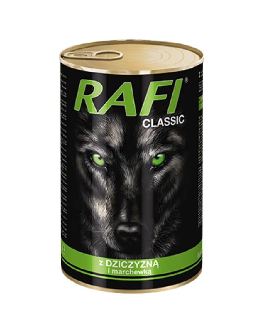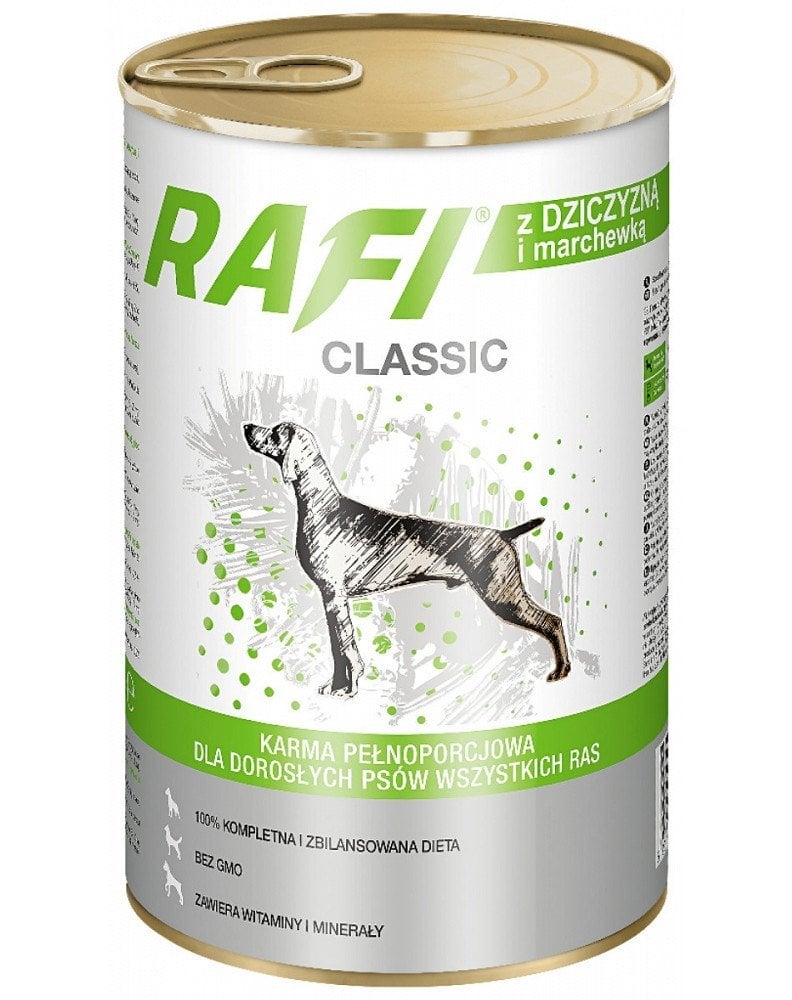 Krmivo v konzerve je určené dospelým psom všetkých plemien, kúsky srnky a mrkvy sú ponorené do chutnej omáčky.