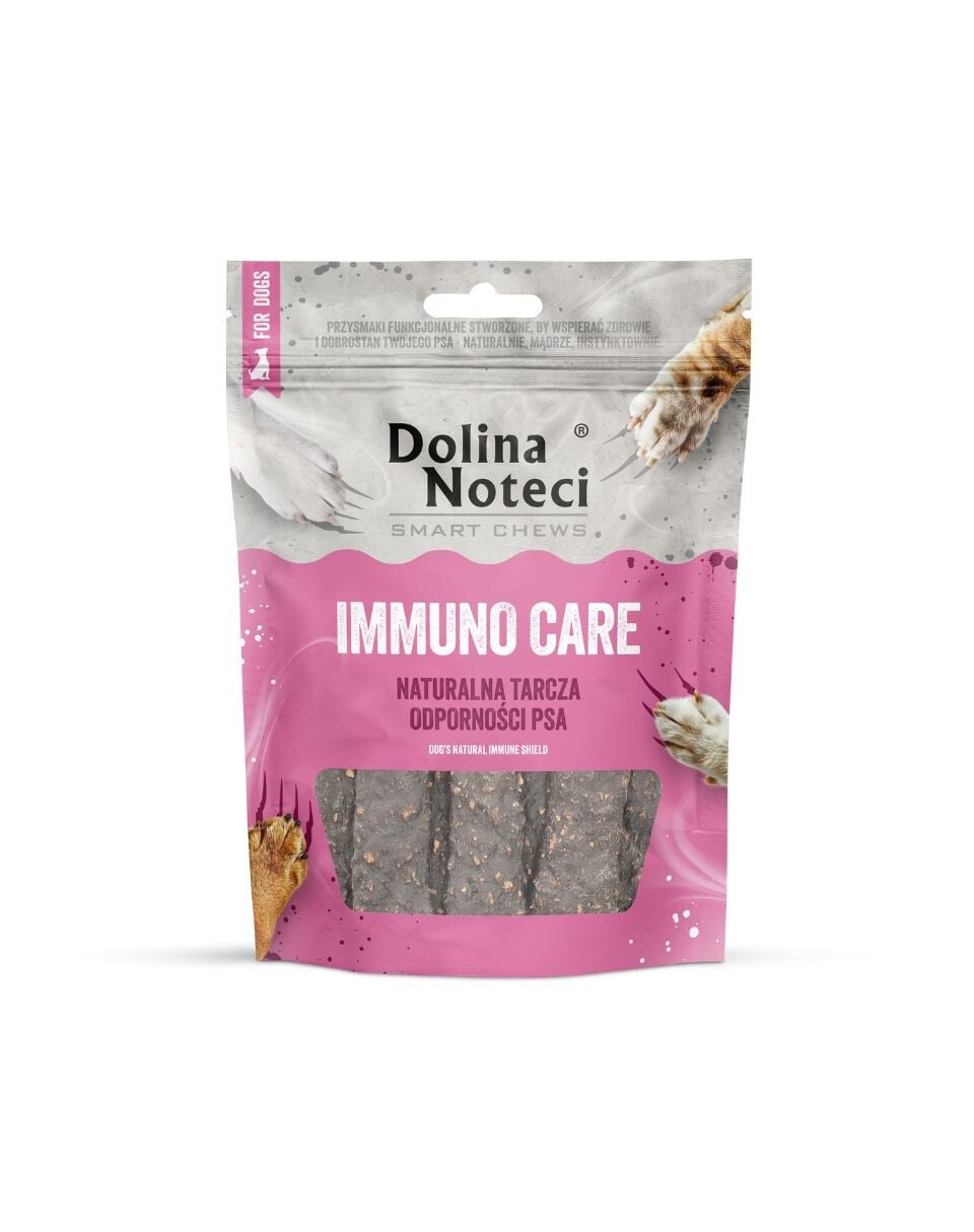 Dolina Noteci Smart Chews Immuno Care je sušený pamlsek vytvořený s ohledem na dospělé psy všech plemen. Obsahuje až 80% masa a živočišných produktů, díky čemuž je výjimečně chutný a hodnotný z hlediska výživy. Představuje bohatý zdroj bílkovin, aminokyselin a mastných kyselin, které pomáhají udržovat optimální kondici a zdraví čtyřnohých přátel.