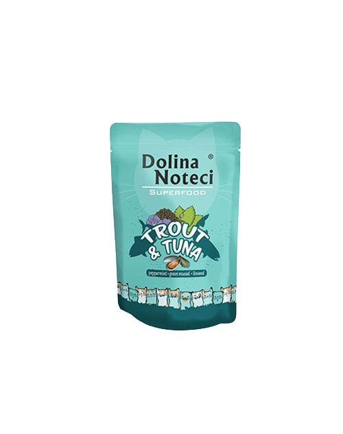 Mokré kompletné krmivo pre mačky so pstruhom a tuniakom.