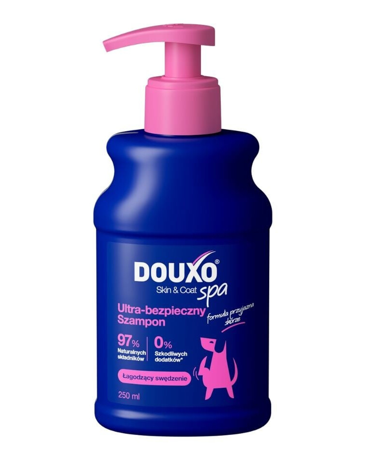 DOUXO Skin & Coat SPA Ultra bezpečný šampón pre psov s citlivou a svrbiacou pokožkou. Jemne čistí pokožku a upokojuje nepohodlie, vyživuje srsť a zanecháva ju jemnú a lesklú. Receptúra šetrná k pokožke.