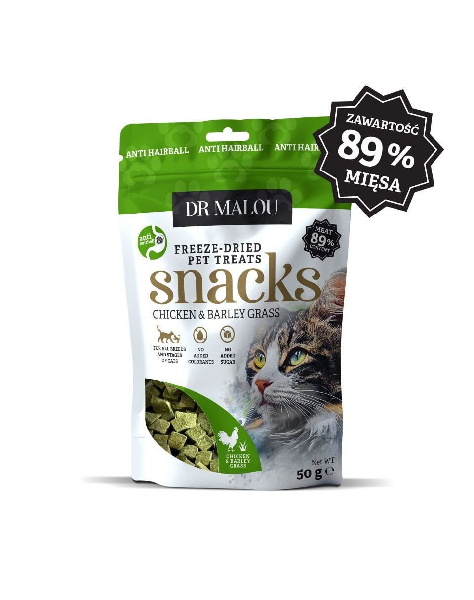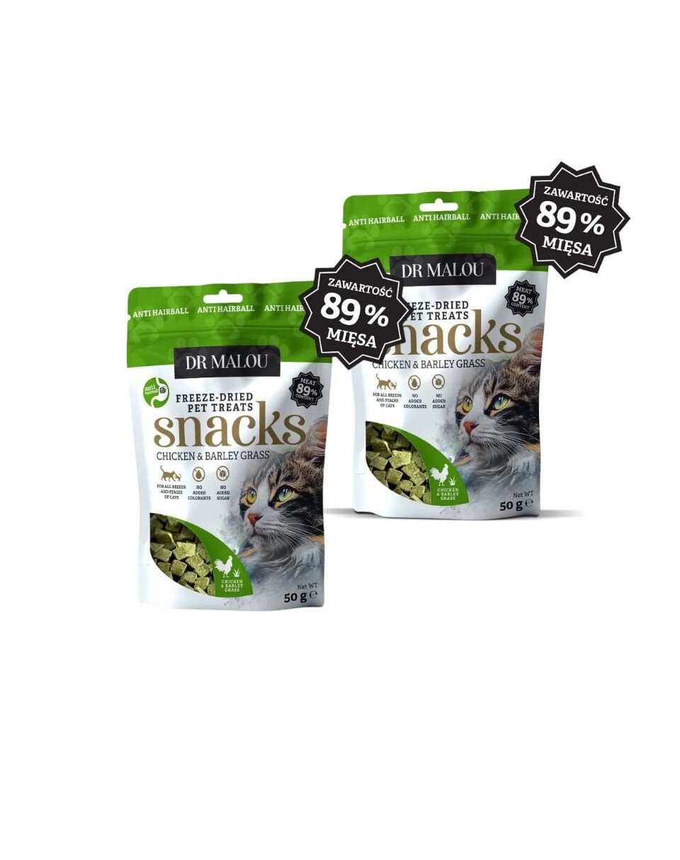 Krmivo doplnkové pre mačky – 100% lyofilizované kostky s kuracím mäsom a jačmennou trávou Dr Malou