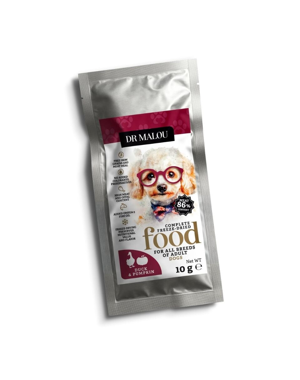 Liofilizovaná kompletná strava Dr Malou Kačica s Tekvicou je alternatívou k štandardnému stravovaniu, určená majiteľom, ktorí chcú ponúknuť svojmu psovi prirodzenú diétu, bez obilnín, umelých prísad a farbív. Vďaka inovatívnemu procesu liofilizácie strava zachováva plné spektrum výživových hodnôt a jedinečnú, prirodzenú chuť čerstvých zložiek.