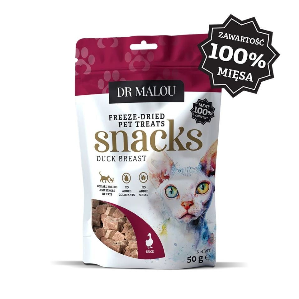 Jedinečné, zdravé a prírodné maškrty pre Vašu mačku! Lyofilizované kocky Dr Malou sú doplnkové krmivo, ktorého zloženie hovorí samo za seba – 100% mäsa z prsnej časti kačky. Bez zbytočných prísad, konzervantov, farbív, obilnín a cukru. Iba čistá kvalita a plnosť výživových hodnôt!