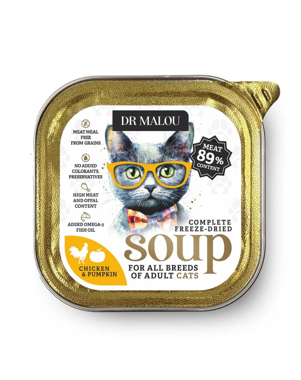 Hľadáte zdravé a prírodné jedlo pre svoju mačku? Spoznajte DR MALOU Zupku liofilizovanú s kuracím mäsom a tekvicou – plnohodnotnú mokrú stravu vytvorenú s ohľadom na prirodzené potreby vášho miláčika!