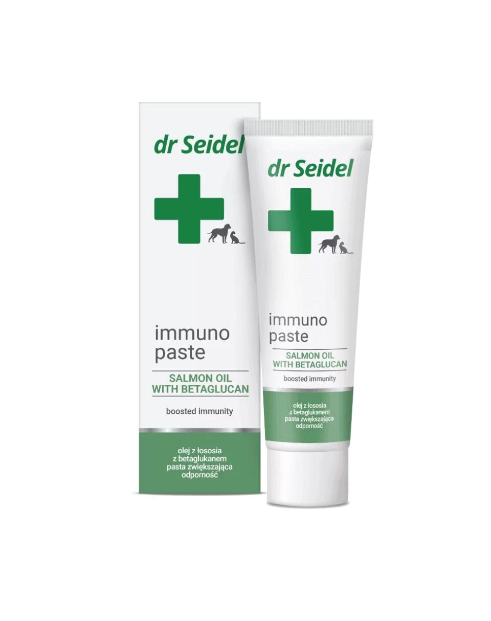 Dr Seidel Immuno Paste je špecializovaná pasta podporujúca imunitu vášho miláčika. Vďaka obsahu unikátneho β-1,3/1,6-D-glukánu stimuluje prirodzené obranné mechanizmy organizmu, skracuje čas rekonvalescencie a urýchľuje proces hojenia. Navyše olej z lososa a olej z pečene tresky sú cenným zdrojom omega-3 mastných kyselín, ktoré podporujú imunitu a starajú sa o zdravú pokožku a srsť. Pasta sa výborne osvedčí u oslabených, starších, mladých zvierat a počas a po chorobe.