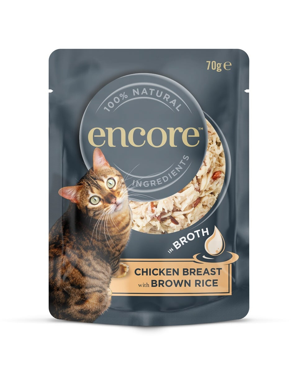Encore Cat Chicken Breast with Brown Rice in Broth je prírodné, bezobilninové (v zmysle bez typických obilnín ako pšenica, kukurica – hoci obsahuje hnedú ryžu) doplnkové krmivo pre dospelé mačky. Receptúra založená na vysokej obsahu mäsa z kuracích pŕs a prídavku hnedej ryže v ľahkom vývare, ktorá zabezpečuje chutnosť, ľahkú stráviteľnosť a podporuje hydratáciu.