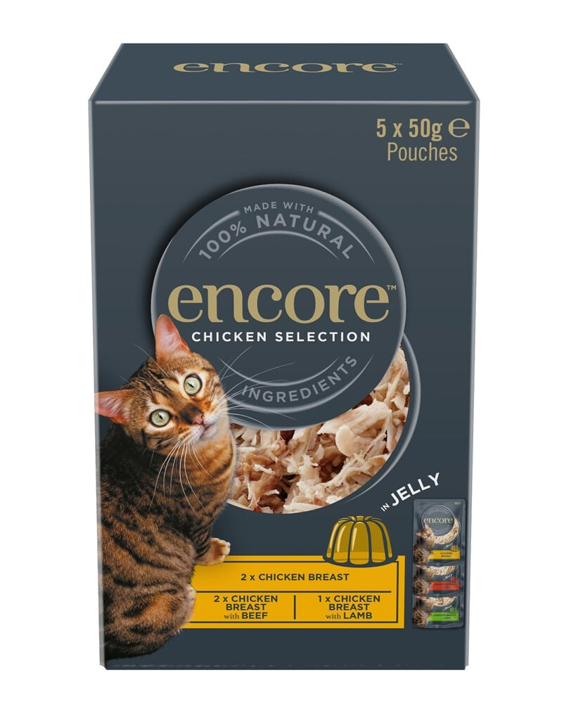ENCORE Cat Adult Chicken Selection in Jelly je prírodné doplnkové krmivo pre dospelé mačky, dostupné vo forme multipacku 5 vreciek po 50 g každá. Sada ponúka rôzne chuťové varianty založené na kuracích prsiach, uzavretých v ľahkom, chutnom želé (“in Jelly”), čo zvyšuje atraktivitu jedla. Formula produktu je založená na prírodných zložkách, bez umelých farbív a konzervantov.