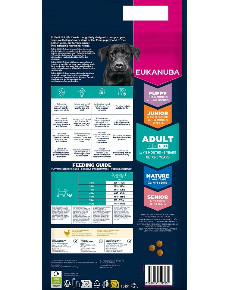 EUKANUBA Life Care je prémiová línia krmív, vytvorená na základe vedeckých výskumov, aby podporovala potreby psov v každom štádiu života. Varianta Adult Large Breeds Chicken bola vyvinutá pre dospelých psov veľkých plemien vo veku 18 mesiacov – 6 rokov a psov obrovských plemien vo veku 2–5 rokov.