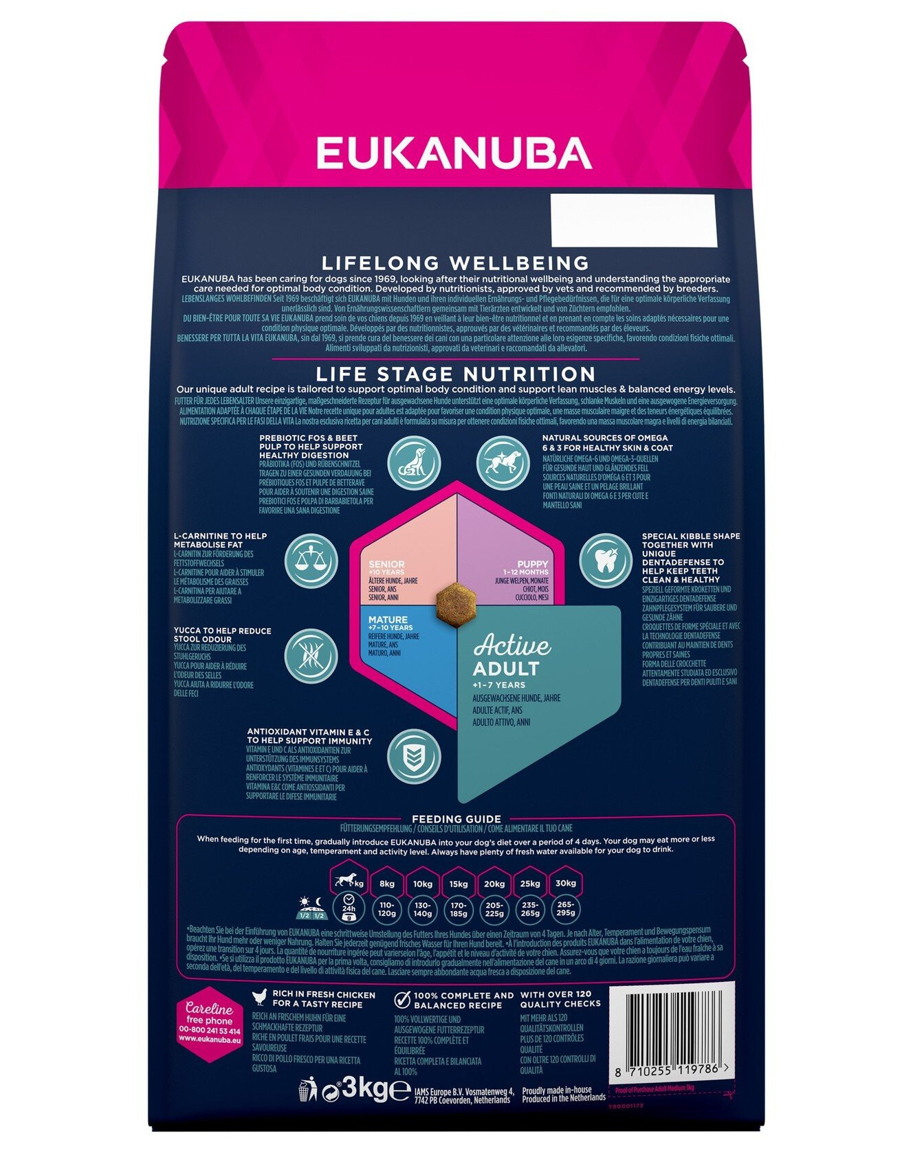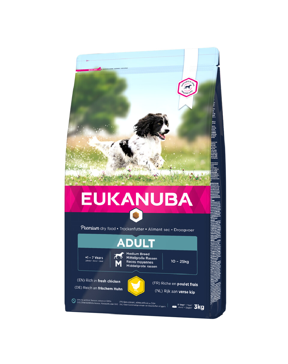 Nový a vylepšený recept EUKANUBA je prispôsobený životnému stavu psa. 100% kompletné dospelé krmivo pre psov (Active Adult) stredných plemien vo veku od 1 do 7 rokov poskytuje výživu na podporu optimálneho stavu tela.