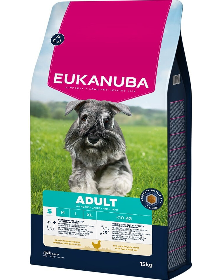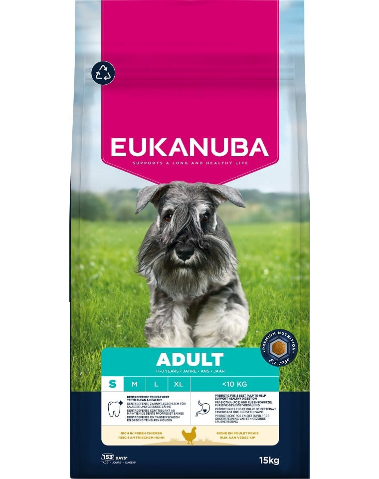 Krmivo EUKANUBA pre dospelé psy, bohaté na čerstvé kurča, je 100 % kompletná a vyvážená receptúra ideálna pre malé plemená vo veku od 1 do 8 rokov.