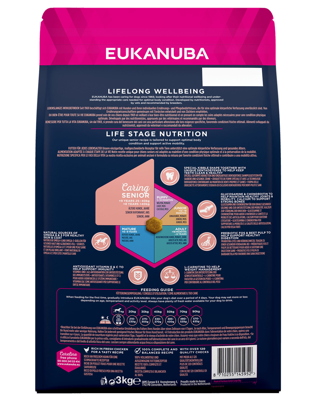 Nový a vylepšený recept EUKANUBA je prispôsobený životnému stavu psa. 100% kompletné krmivo pre seniorov (Starostlivosť Senior) veľkých plemien vo veku od 9 rokov, poskytuje výživu pre podporu optimálnej telesnej kondície (optimálnej telesnej kondície) a aktivitu.