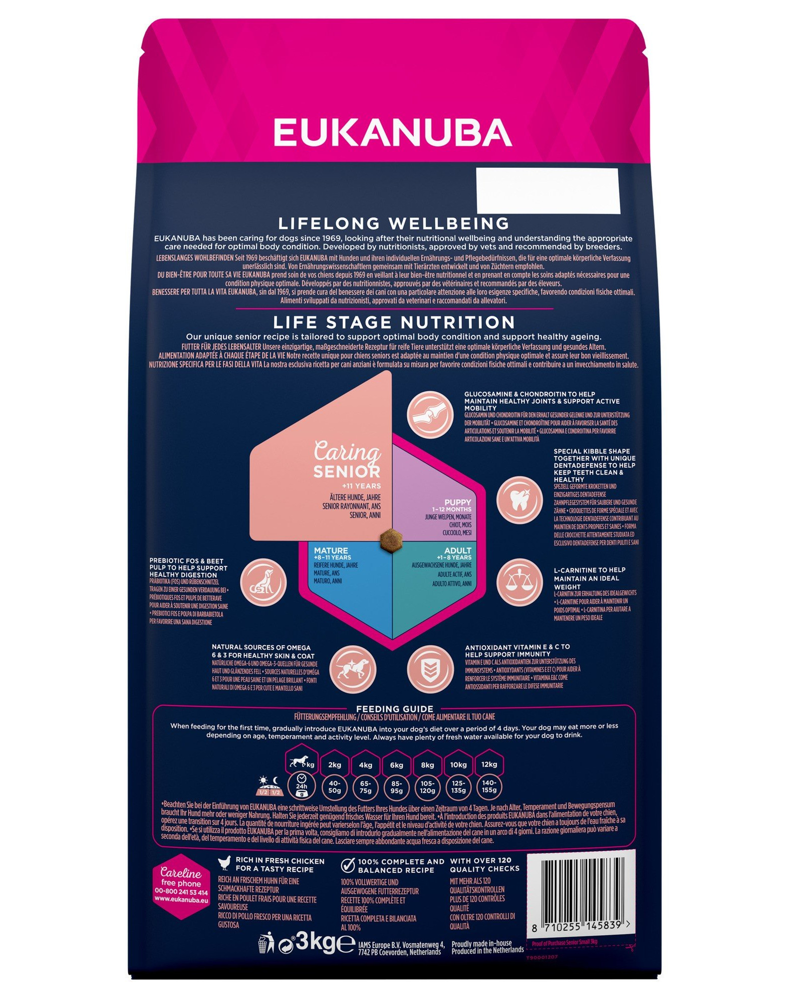 Nový a vylepšený recept EUKANUBA je prispôsobený životnému stavu psa. 100% kompletné krmivo pre seniorov (Starostlivosť Senior) malých plemien od veku 11 rokov, poskytuje výživu pre podporu optimálnu telesnú kondíciu (optimálnej telesnej kondície) a zdravého starnutia.