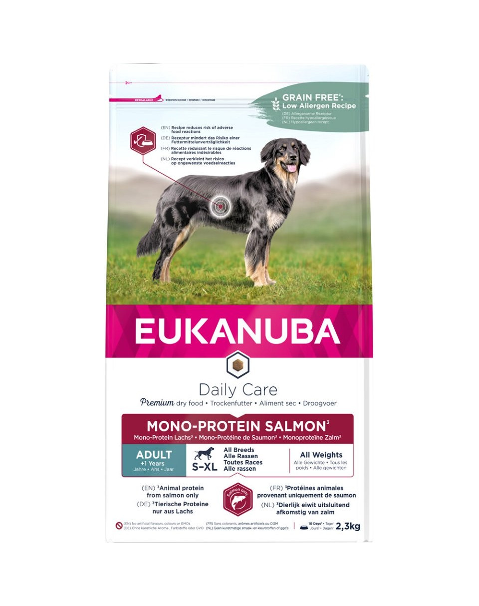 EUKANUBA Daily Care krmivo pre dospelých psov Monoprotein Losos * obsahuje iba jeden zdroj živočíšnych bielkovín. Všetky zložky živočíšneho pôvodu v tomto krmive sú čisto z lososa, aby sa znížilo riziko nežiaducich reakcií na jedlo a pomáhajú udržiavať štíhle svaly. Tento chutný recept obsahuje prebiotiká FOS, MOS a repnú dužinu na podporu trávenia.
