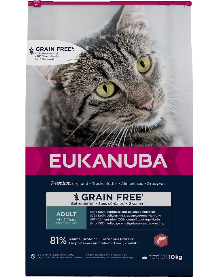 Naše suché krmivo pre dospelé mačky EUKANUBA Grain Free predstavuje alternatívu pre mačky so špeciálnymi stravovacími požiadavkami. Toto 100 % kompletné a vyvážené krmivo má vysoký podiel živočíšnych bielkovín, ktorý predstavuje 81 % celkového obsahu bielkovín, čo podporuje vývoj a udržiavanie netukovej svaloviny. Obsiahnuté antioxidanty pomáhajú podporovať prirodzenú obranyschopnosť a podporujú vitalitu. Receptúra bohatá na lososa poskytuje omega-3 mastné kyseliny z prírodných zdrojov. Do zloženia sme pridali extra dávku taurínu na podporu zdravia srdca. Naše alternatívne zdroje sacharidov - zemiaky a hrášok - poskytujú prirodzený zdroj vlákniny a minerálnych látok. Obsiahnuté kvasnice navyše slúžia ako prirodzený zdroj vitamínov a esenciálnych aminokyselín. Všetky tieto zložky sú dôležité pre zdravie dospelej mačky a aktívne prispievajú k udržaniu jej pohody počas celého života.