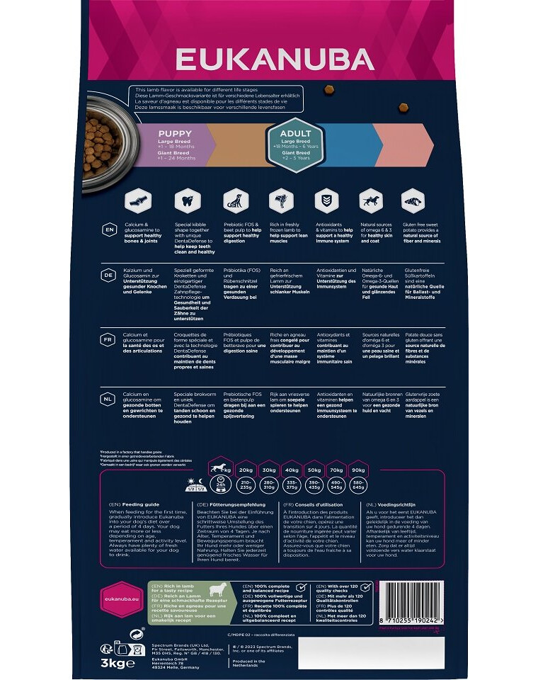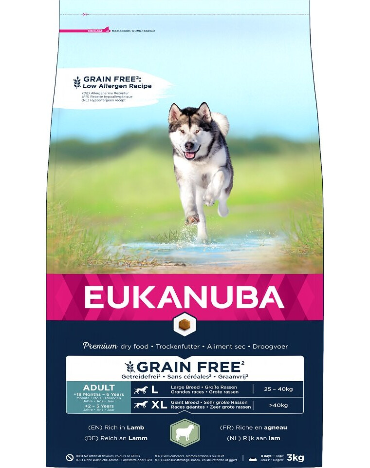 EUKANUBA Grain Free suché krmivo bohaté na čerstvé mrazené jahňacie mäso pre dospelých psov veľkých a obrích plemien podporuje udržiavanie netukového svalstva. Súčasťou receptúry sú antioxidanty a vitamíny pre správnu funkciu imunitného systému a bezlepkové bataty ako prirodzený zdroj vlákniny a minerálnych látok. Na ešte účinnejšiu podporu správneho trávenia boli do krmiva pridané repná dužina a prebiotiká FOS. Prídavok vápnika a glukozamínu má zase pozitívny vplyv na zdravie kostí a kĺbov. Obsah prírodných zdrojov omega-6 a omega-3 mastných kyselín má navyše pozitívny vplyv na zdravie kože a lesklú srsť. Špeciálny tvar granúl a jedinečný systém DentaDefense pomáhajú udržiavať zdravé a čisté zuby. EUKANUBA Grain Free krmivo pre dospelé psy veľkých a obrích plemien je 100 % kompletné a vyvážené, čím zabezpečuje pohodu vášho psa.