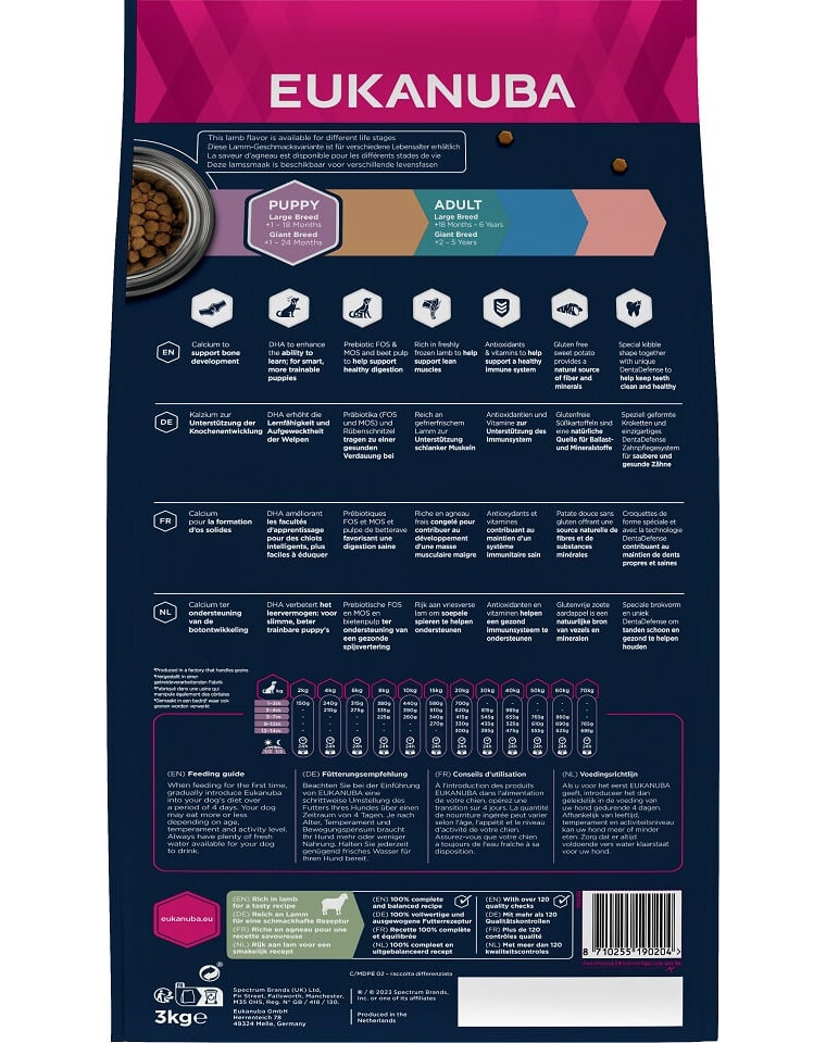 EUKANUBA Grain Free suché krmivo bohaté na čerstvé mrazené jahňacie mäso pre šteňatá veľkých a obrích plemien podporuje udržiavanie netukového svalstva. Súčasťou zloženia sú antioxidanty a vitamíny pre správnu funkciu imunitného systému a bezlepkové bataty ako prirodzený zdroj vlákniny a minerálnych látok. Na ešte účinnejšiu podporu správneho trávenia boli do krmiva pridané repná dužina a prebiotiká FOS a MOS, ako aj správne množstvo vápnika na podporu zdravia kostí. Krmivo obsahuje aj kyseliny DHA, ktoré majú pozitívny vplyv na schopnosť šteniat učiť sa. Špeciálny tvar granúl a jedinečný systém DentaDefense pomáhajú udržiavať zdravé a čisté zuby. EUKANUBA Grain Free krmivo pre šteňatá veľkých a obrích plemien je 100 % kompletné a vyvážené a poskytuje vášmu šteňaťu pevný základ zdravia v dospelosti.