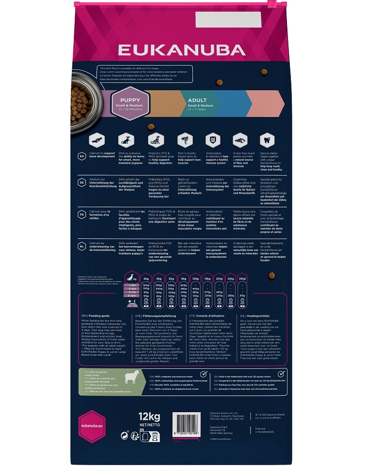 EUKANUBA Grain Free suché krmivo bohaté na čerstvo zmrazené jahňacie mäso pre šteňatá malých a stredných plemien podporuje udržiavanie netukového svalstva. Súčasťou zloženia sú antioxidanty a vitamíny pre správnu funkciu imunitného systému a bezlepkové bataty ako prirodzený zdroj vlákniny a minerálov. Na ešte účinnejšiu podporu správneho trávenia boli do krmiva pridané repná dužina a prebiotiká FOS a MOS, ako aj správne množstvo vápnika na podporu zdravia kostí. Obsah prírodných zdrojov omega-3 mastných kyselín má navyše pozitívny vplyv na zdravie kože a lesklú srsť. Krmivo obsahuje aj kyseliny DHA, ktoré majú pozitívny vplyv na schopnosť učenia šteniat. Špeciálny tvar granúl a jedinečný systém DentaDefense pomáhajú udržiavať zdravé a čisté zuby. EUKANUBA Grain Free krmivo pre šteňatá malých a stredných plemien je 100 % kompletné a vyvážené a poskytuje vášmu šteňaťu pevný základ zdravia v dospelosti.