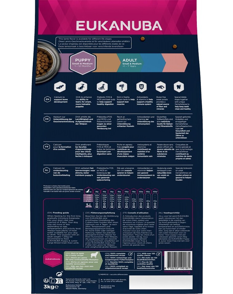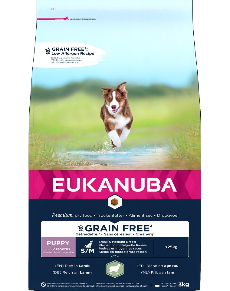 EUKANUBA Grain Free suché krmivo bohaté na čerstvo zmrazené jahňacie mäso pre šteňatá malých a stredných plemien podporuje udržiavanie netukového svalstva. Súčasťou zloženia sú antioxidanty a vitamíny pre správnu funkciu imunitného systému a bezlepkové bataty ako prirodzený zdroj vlákniny a minerálov. Na ešte účinnejšiu podporu správneho trávenia boli do krmiva pridané repná dužina a prebiotiká FOS a MOS, ako aj správne množstvo vápnika na podporu zdravia kostí. Obsah prírodných zdrojov omega-3 mastných kyselín má navyše pozitívny vplyv na zdravie kože a lesklú srsť. Krmivo obsahuje aj kyseliny DHA, ktoré majú pozitívny vplyv na schopnosť učenia šteniat. Špeciálny tvar granúl a jedinečný systém DentaDefense pomáhajú udržiavať zdravé a čisté zuby. EUKANUBA Grain Free krmivo pre šteňatá malých a stredných plemien je 100 % kompletné a vyvážené a poskytuje vášmu šteňaťu pevný základ zdravia v dospelosti.