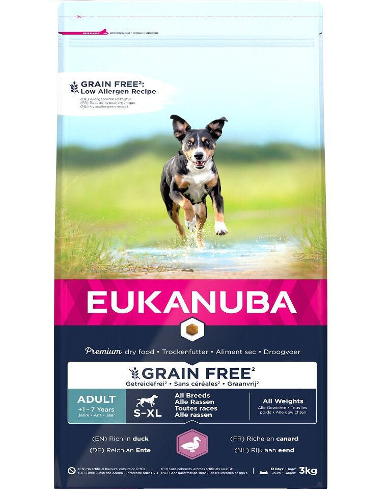 EUKANUBA Grain Free je krmivo pre dospelých psov všetkých plemien, bohaté na čerstvo zmrazenú kačicu, ktorá pomáha udržiavať netukové svalstvo. Súčasťou zloženia sú antioxidanty a vitamíny pre správnu funkciu imunitného systému a bezlepkové bataty ako prirodzený zdroj vlákniny a minerálov. Na ďalšiu podporu správneho trávenia bola do krmiva pridaná repná dužina a prebiotiká FOS, ako aj dostatok vápnika na podporu zdravia kostí. Obsah prírodných zdrojov omega-6 a omega-3 mastných kyselín má zase pozitívny vplyv na zdravie kože a lesklú srsť. Špeciálny tvar granúl a jedinečný systém DentaDefense pomáhajú udržiavať zdravé a čisté zuby. EUKANUBA Grain Free pre dospelé psy všetkých plemien je 100 % kompletné a vyvážené krmivo, ktoré zabezpečuje pohodu vášho psa.
