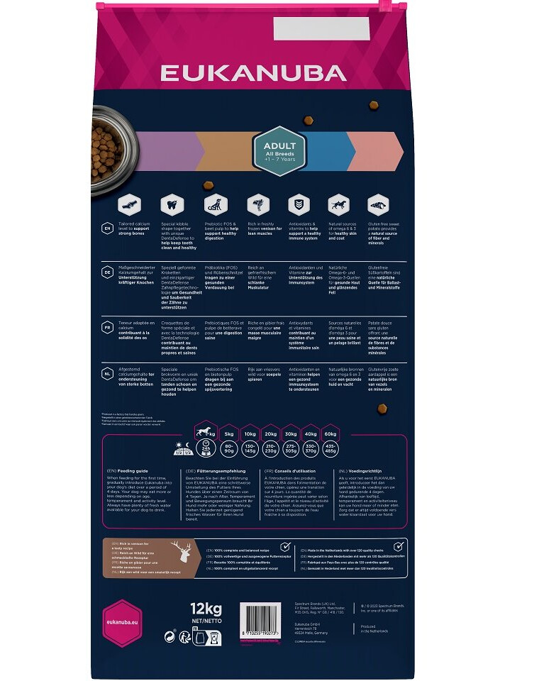 EUKANUBA Grain Free suché krmivo bohaté na čerstvo zmrazenú zverinu pre dospelých psov všetkých plemien podporuje udržiavanie netukovej svaloviny. Súčasťou zloženia sú antioxidanty a vitamíny pre správnu funkciu imunitného systému a bezlepkové bataty ako prirodzený zdroj vlákniny a minerálnych látok. Na ďalšiu podporu správneho trávenia bola do krmiva pridaná repná dužina a prebiotiká FOS, ako aj dostatok vápnika na podporu zdravia kostí. Okrem toho má obsah prírodných zdrojov omega-6 a omega-3 mastných kyselín pozitívny vplyv na zdravie kože a lesklú srsť. Špeciálny tvar granúl a jedinečný systém DentaDefense pomáhajú udržiavať zdravé a čisté zuby. EUKANUBA Grain Free krmivo pre dospelé psy všetkých plemien je 100 % kompletné a vyvážené, čím zabezpečuje pohodu vášho psa.