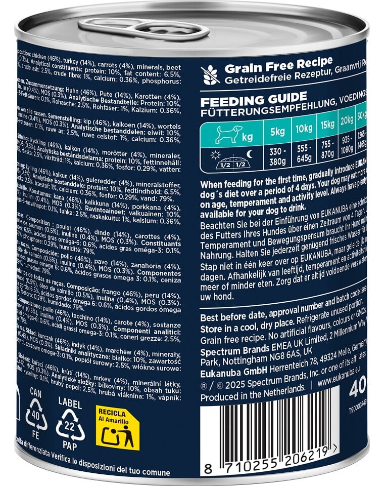 Produkt má formu hrubozrnnej paštéty s viditeľnými kúskami mäsa a zeleniny, čo robí jedlo atraktívnym a chutným pre psov. Krmivo neobsahuje umelé farbivá, arómy ani konzervačné látky. Môže sa podávať samostatne alebo v kombinácii so suchým krmivom EUKANUBA, čím vytvára plnohodnotné a výživné jedlo.