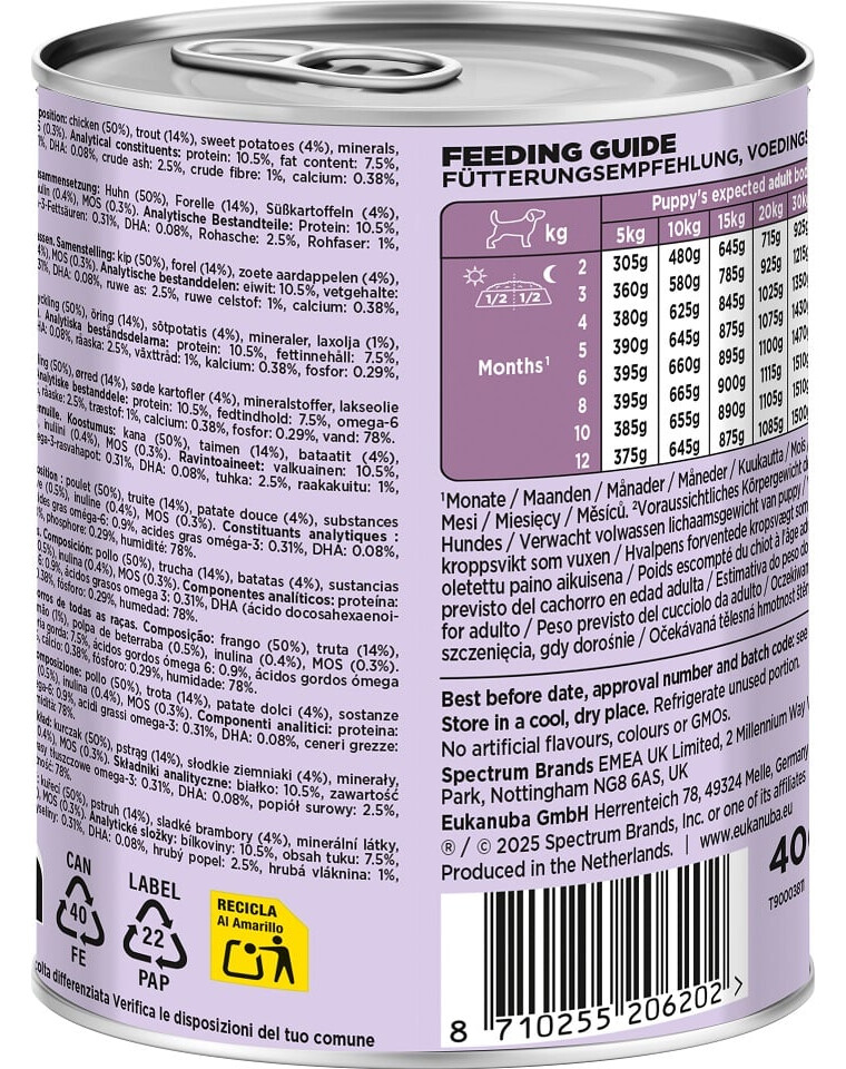 Krmivo má formu hrubozrnného paštéty s viditeľnými kúskami mäsa a zeleniny, čo ho robí mimoriadne chutným a atraktívnym pre šteniatka. Neobsahuje umelé farbivá, arómy ani konzervanty. Môže sa podávať samostatne alebo ako doplnok k suchému krmivu EUKANUBA, čím vytvára plnohodnotné a rozmanité jedloZloženie: kuracie (50%), pstruh (14%), sladké zemiaky (4%), minerály, olej z lososa (1%), cukrová repa (0.5%), inulín (0.4%), MOS (0.3%).