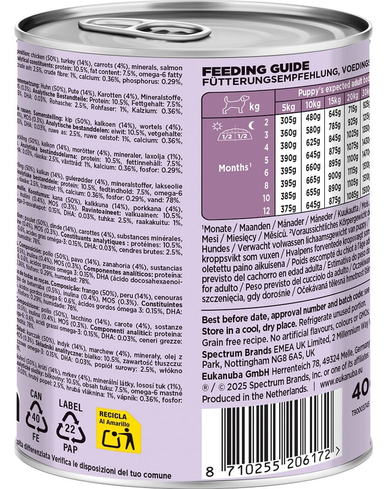 Krmivo má formu hrubozrnnej paštéty s viditeľnými kúskami mäsa a zeleniny, čo robí jedlo chutným a atraktívnym pre šteniatka. Produkt neobsahuje umelé farbivá, arómy ani konzervanty. Môže sa podávať samostatne alebo v kombinácii so suchým krmivom EUKANUBA, čím vytvára plnohodnotné a výživné jedlo.