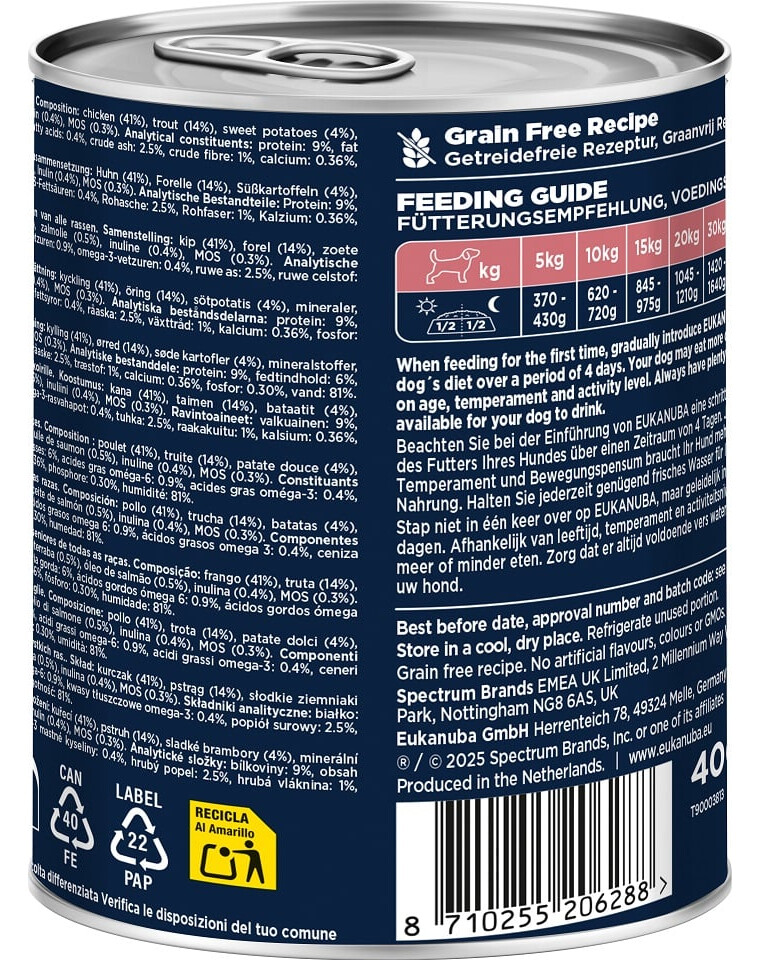 Krmivo má formu hrubozrnnej paštéty s kúskami mäsa a zeleniny, vďaka čomu je mimoriadne chutné a psami obľúbené. Produkt neobsahuje umelé farbivá, arómy ani konzervanty. Môže byť podávané ako samostatné jedlo alebo v kombinácii so suchým krmivom EUKANUBA, čím zabezpečuje plnohodnotné a chutné stravovanie.