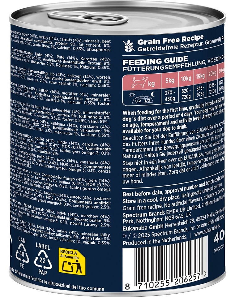 Krmivo má podobu hrubozrnnej paštéty s viditeľnými kúskami mäsa a zeleniny, vďaka čomu je veľmi chutné. Neobsahuje umelé farbivá, arómy ani konzervanty. Môže byť podávané samostatne alebo v kombinácii so suchým krmivom EUKANUBA, čím vytvára zdravé a výživné jedlo.