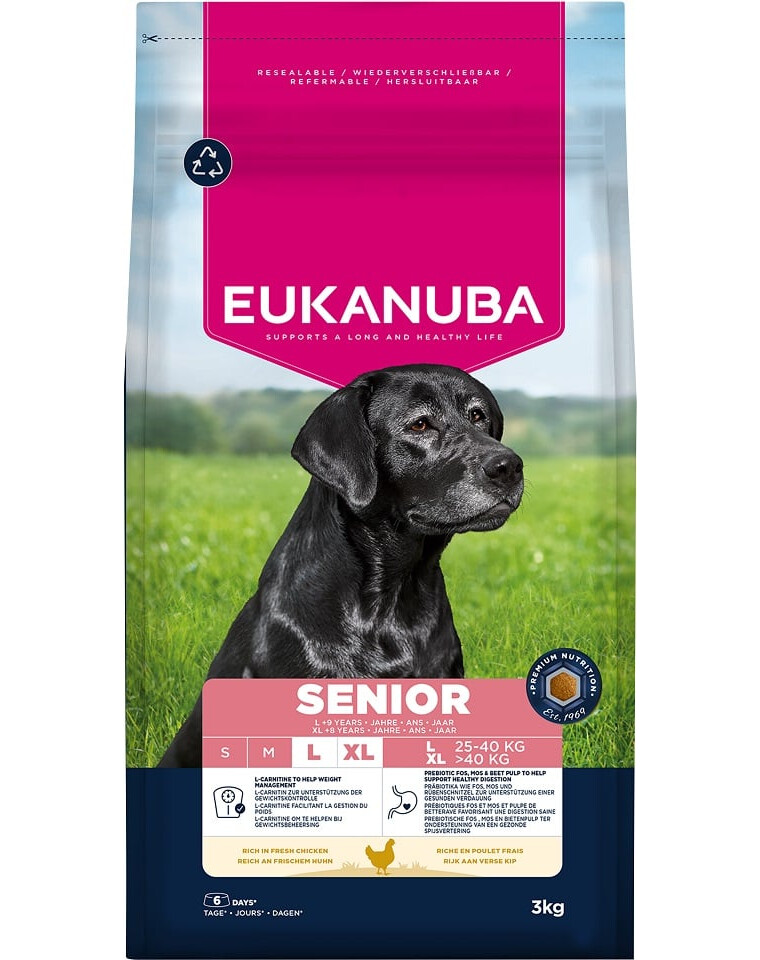 Suché krmivo EUKANUBA pre starších psov, bohaté na čerstvé kurča, je 100% kompletné a vyvážené a ideálne pre veľké plemená vo veku nad 9 rokov (alebo nad 8 rokov v prípade obrovských plemien).