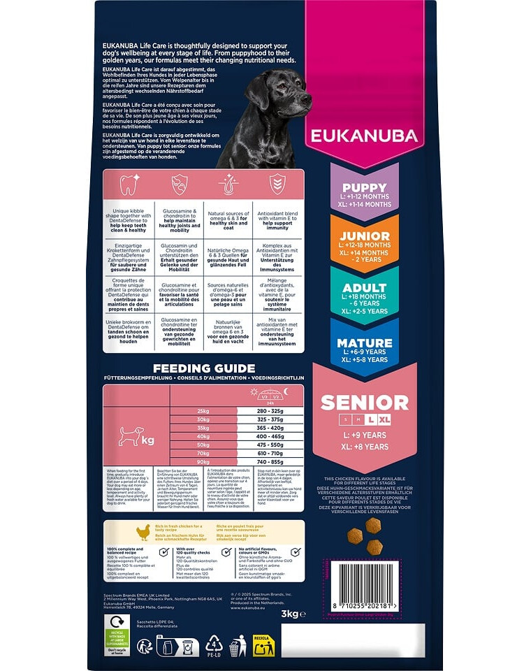 EUKANUBA Life Care je prémiová línia krmív vyvinutá na základe vedeckého výskumu, ktorá podporuje meniace sa výživové potreby psov v každom štádiu života. Formula určená pre starších psov veľkých plemien (vrátane obrovských) obsahuje vysokokvalitné čerstvé kurča, ktoré poskytuje proteíny podporujúce udržanie svalovej hmoty a optimálnu kondíciu.