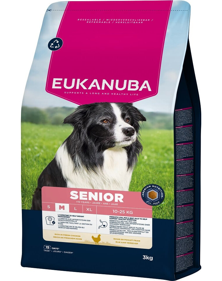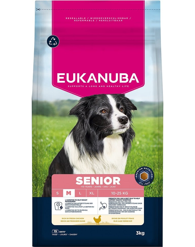Suché krmivo EUKANUBA pre starších psov, bohaté na čerstvé kurča, je 100% kompletné, vyvážené a ideálne pre psov stredných plemien vo veku nad 10 rokov.