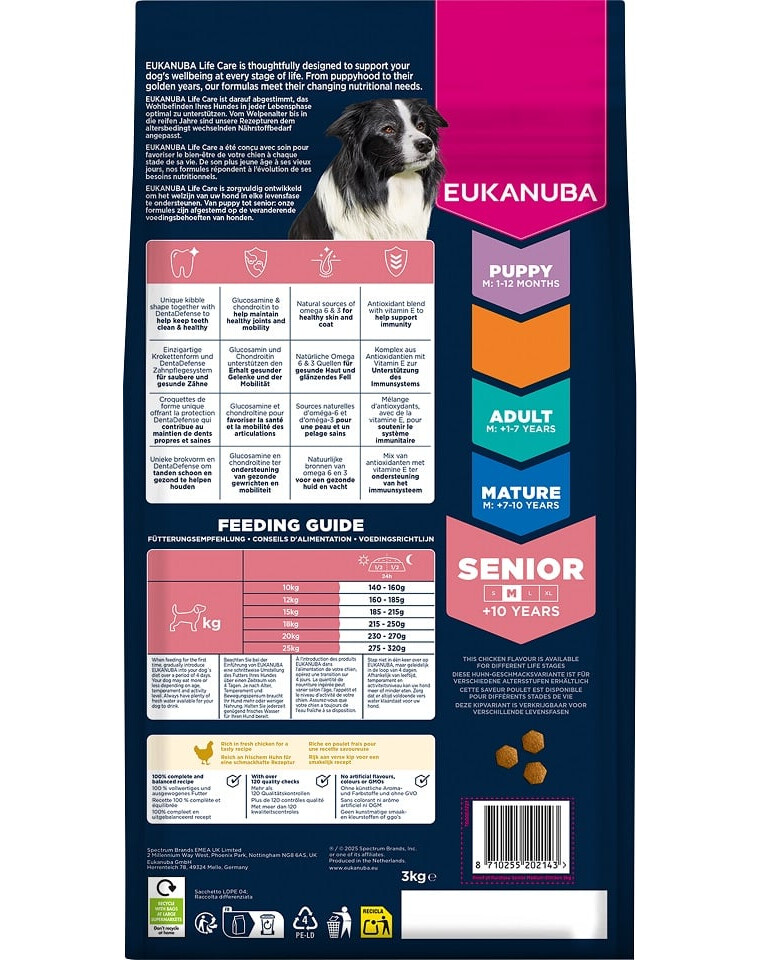 EUKANUBA Life Care je línia prémiových krmív vyvinutá na základe vedeckých výskumov, ktorá podporuje meniace sa výživové potreby psov v každom štádiu života. Formula vytvorená špeciálne pre starších psov stredných plemien vo veku nad 10 rokov obsahuje čerstvé kurča – zdroj vysoko kvalitných proteínov podporujúcich udržanie svalovej hmoty a sily.