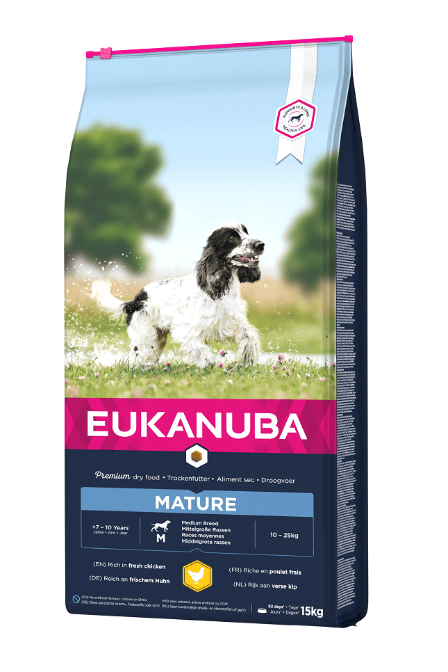 Nový a vylepšený recept EUKANUBA je prispôsobený životnej etape psa. 100% kompletné krmivo pre prosperujúce dospelé psy stredných plemien vo veku 7-10 rokov poskytuje výživu, ktorá podporuje optimálnu kondíciu tela a zdravé starnutie.