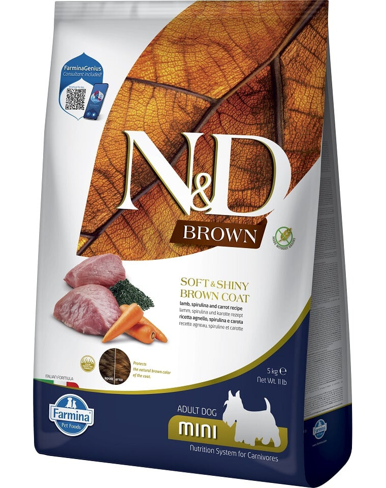 N&D Brown je vysokokvalitné, vyvážené krmivo vyvinuté s ohľadom na dospelých psov s tmavou srsťou. Vďaka jedinečnej kombinácii jahňaciny, spiruliny a mrkvy podporuje zdravie pokožky a intenzívnu, jednotnú farbu hnedej alebo čiernej srsti. Obsahované Omega-3 mastné kyseliny pomáhajú udržiavať lesklú, jemnú srsť a chránia pred zápalmi pokožky.