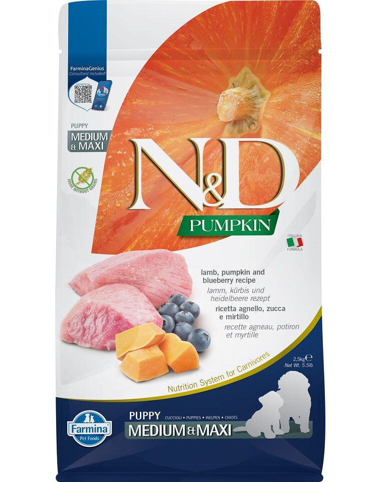 Kompletné krmivo pre šteniatka a gravidné alebo laktujúce sučky s jahňacinou, tekvicou a pridaním bobúľ. Je určené pre psov stredných a veľkých plemien.