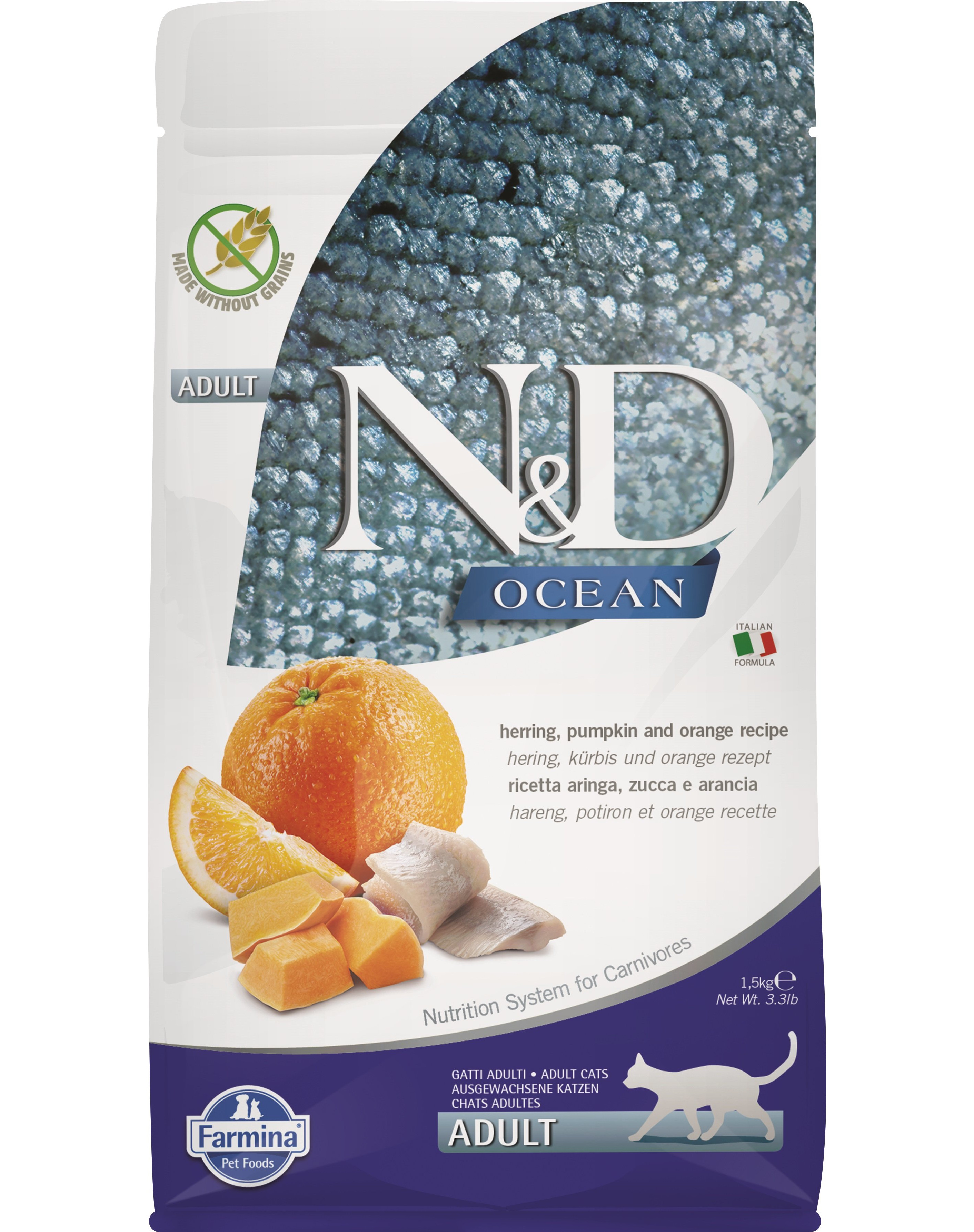 Krmivo obsahuje živočíšne bielkoviny získané iba z rýb. Čerstvé a sušené sleďové mäso tvorí až 62% z celého receptu, čo zabezpečuje zdravý rast, vývoj a dobrý stav mačky. Do krmiva sa pridávajú pomaranče a tekvica, ktoré úplne nahradili obilniny. Poskytujú veľké množstvo vitamínov, najmä C, vlákninu a minerály. Tekvica má veľa vitamínu A a antioxidantov, podporuje imunitný a kardiovaskulárny systém a má tiež protizápalové a antiparazitické účinky. Rybí olej je silná dávka nenasýtených mastných kyselín Omega 3 s protizápalovými vlastnosťami. Pridanie kurkumy má antioxidačné a protirakovinové vlastnosti.