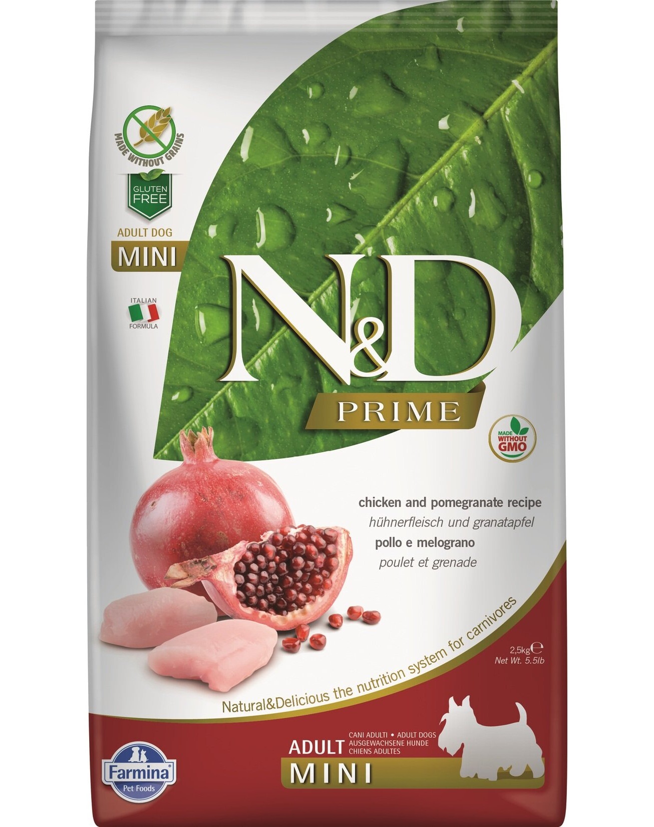 Čerstvé kuracie mäso (26%), sušené kuracie mäso (25%), zemiaky, kurací tuk, sušené celé vajcia, čerstvé sleďové mäso, sušené sleďové mäso, rybí olej (z sleďov), hrachová vláknina, sušená mrkva , sušená lucerna, inulín, fruktooligosacharidy, kvasnicový extrakt (zdroj mannanoligosacharidov), sušené granátové jablko (0,5%), sušené jablko, sušený špenát, psyllium (0,3%), sušené oranžové, sušené čučoriedky, chlorid sodný, sušené pivovarské droždie, kurkuma (0,2%), glukozamín, chondroitín sulfát