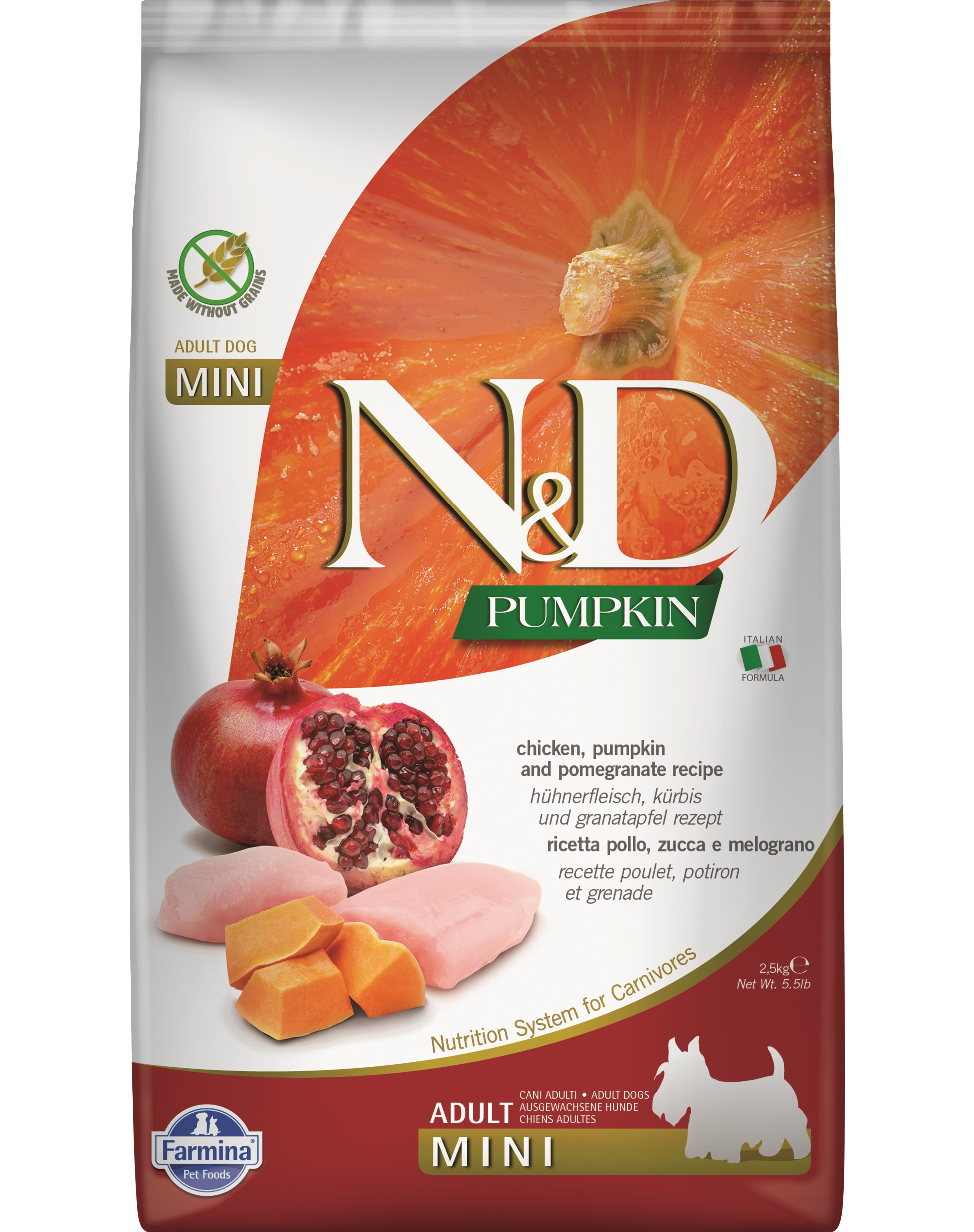 Zloženie: Čerstvé kuracie mäso bez kostí (24%), sušené kuracie mäso (22%), hrachový škrob , kurací tuk, sušená tekvica (5%), sušené vajcia, čerstvé slede, sušené slede, rybí tuk (zo sleďov), rastlinná vláknina z hrachu, sušená mrkva, sušená lucerna, inulín, frukto-oligosacharidy, výťažok z kvasníc (zdroj mannán-oligosacharidov), sušené granátové jablká (0,5%), sušené jablká, sušený špenát, psýlium (0, 3%), sušené čierne ríbezle, sušené pomaranče, sušené čučoriedky, chlorid sodný, sušené pivovarské kvasnice, koreň kurkumy (0,2%), glukozamín, chondroitín sulfát.
