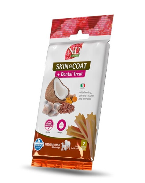 Farmina N&D Quinoa Skin & Coat Herring je funkčná maškrta vytvorená pre psy s dermatologickými problémami, alergiami a potravinovými intoleranciami. Obsahuje 10% bielkovín pochádzajúcich výlučne zo sleďa, čo minimalizuje riziko alergických reakcií. Quinoa, ktorá tvorí 8% zloženia, poskytuje vlákninu, antioxidanty a podporuje trávenie. Prírodná kurkuma (2,5%) pôsobí protizápalovo a bojuje proti oxidačnému stresu, zatiaľ čo kokos (2,5%) poskytuje zdravé tuky, ktoré podporujú regeneráciu pokožky. Maškrta je bohatá na omega-3 mastné kyseliny, ktoré zlepšujú elasticitu pokožky a dodávajú srsti zdravý lesk. Špeciálna dentálna štruktúra pomáha udržiavať čistotu zubov a svieži dych, spájajúc starostlivosť o zdravie ústnej dutiny s každodennou starostlivosťou o pokožku a srsť psa.
