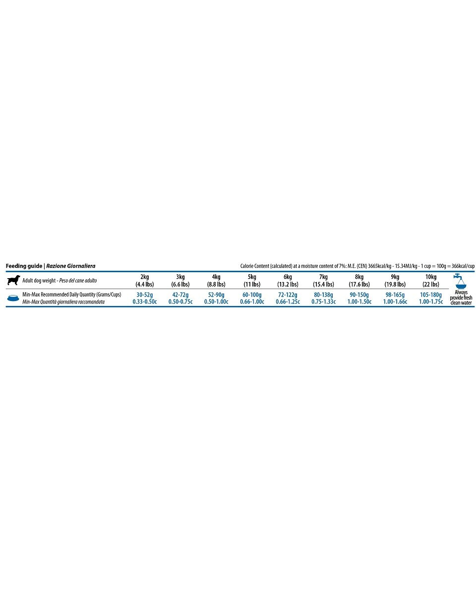 Hrubý proteín 23,00 %; hrubý tuk 12,00 %; hrubá vláknina 2,80 %; hrubá vlhkosť 9,00 %; hrubý popol 7,90 %; vápnik 1,00 %; fosfor 0,80 %; omega-3 mastné kyseliny 1,80 %; omega-6 mastné kyseliny 1,50 %; DHA 0,70 %; EPA 0,50 %; Glukozamín 1200 mg/kg; Chondroitín sulfát 900 mg/kg.