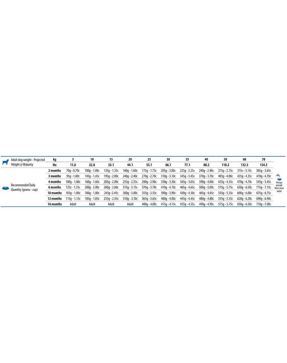 Uvedené dávkovanie je orientačné a malo by sa prispôsobiť individuálne vášmu zvieraťu, pričom sa zohľadňuje úroveň aktivity a zdravotný stav zvieraťa.