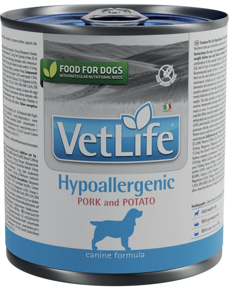 FARMINA Vet Life Natural Diet Dog Hypoallergenic Pork & Potato je kompletné diétne krmivo pre psov, ktoré sa používa na zníženie neznášanlivosti zložiek a živín a na podporu funkcie kože v prípade dermatóz a vypadávania srsti.