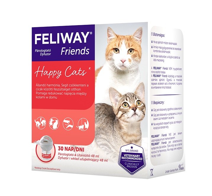 FELIWAY Friends obsahuje syntetický ekvivalent týchto feromónov, ktorý umožňuje posilniť väzby u dospelých mačiek žijúcich pod jednou strechou.