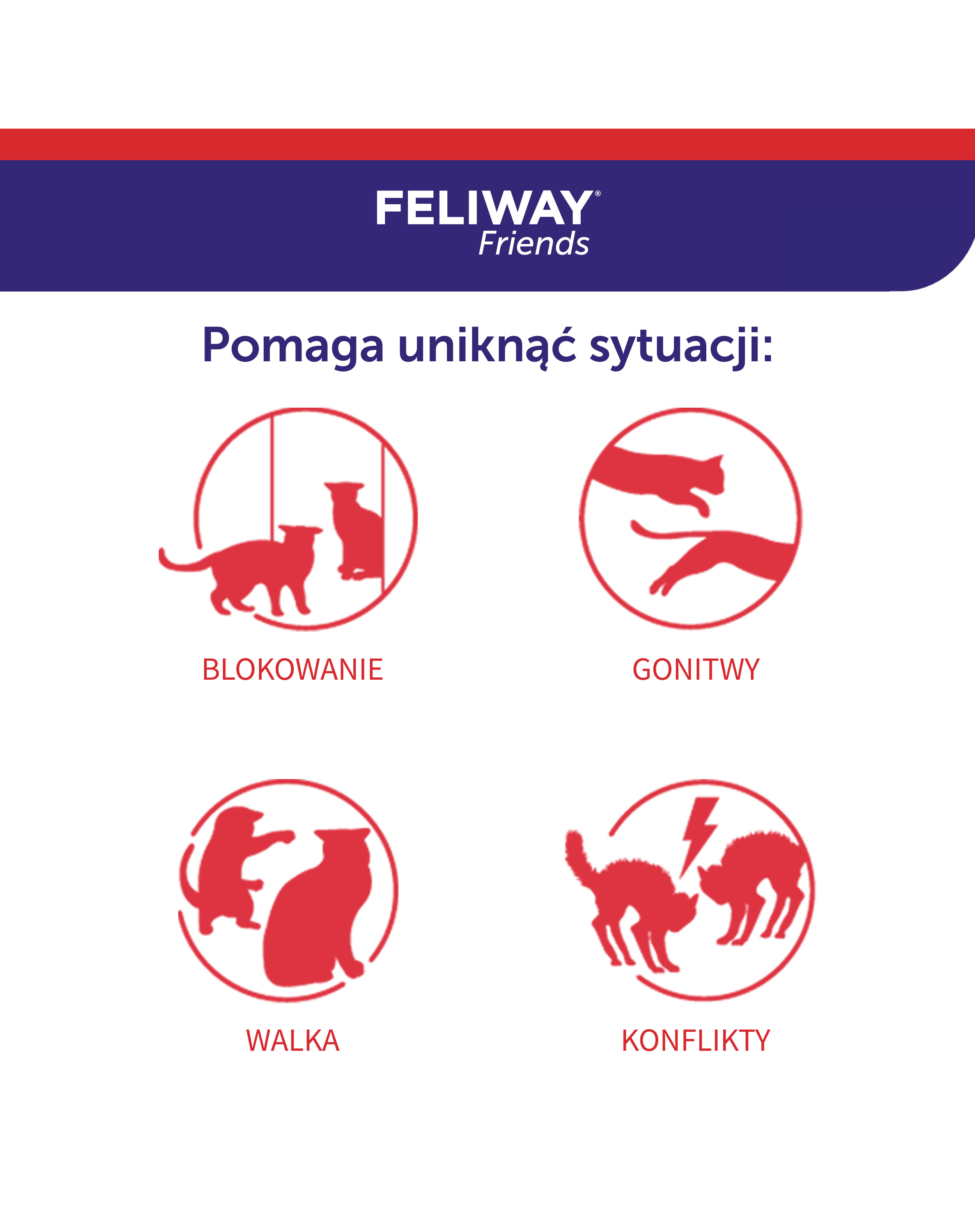 FELIWAY Friends pomáha mačkám žiť v harmónii, vyhýbať sa napätiam a konfliktom, vďaka uvoľňovaniu „signálov harmónie“.